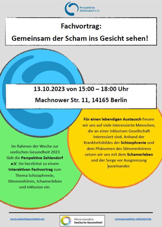 Im Rahmen der Woche der Seelischen Gesundheit 2023 lädt die Perspektive Zehlendorf e. V. Sie herzlichst zu einem interaktiven Fachvortrag zum Thema Schizophrenie, Stimmenhören, Schamerleben und Inklusion ein.